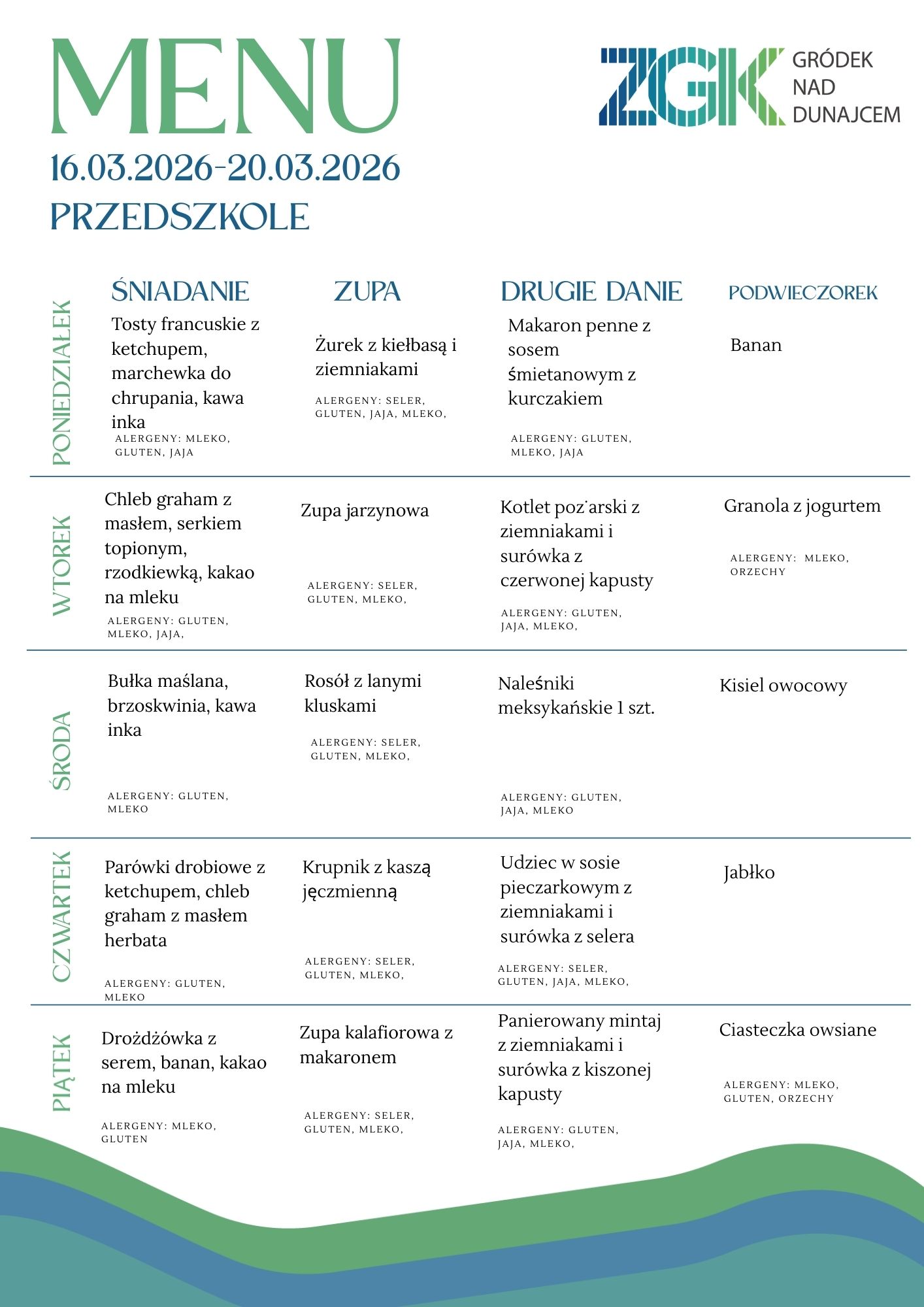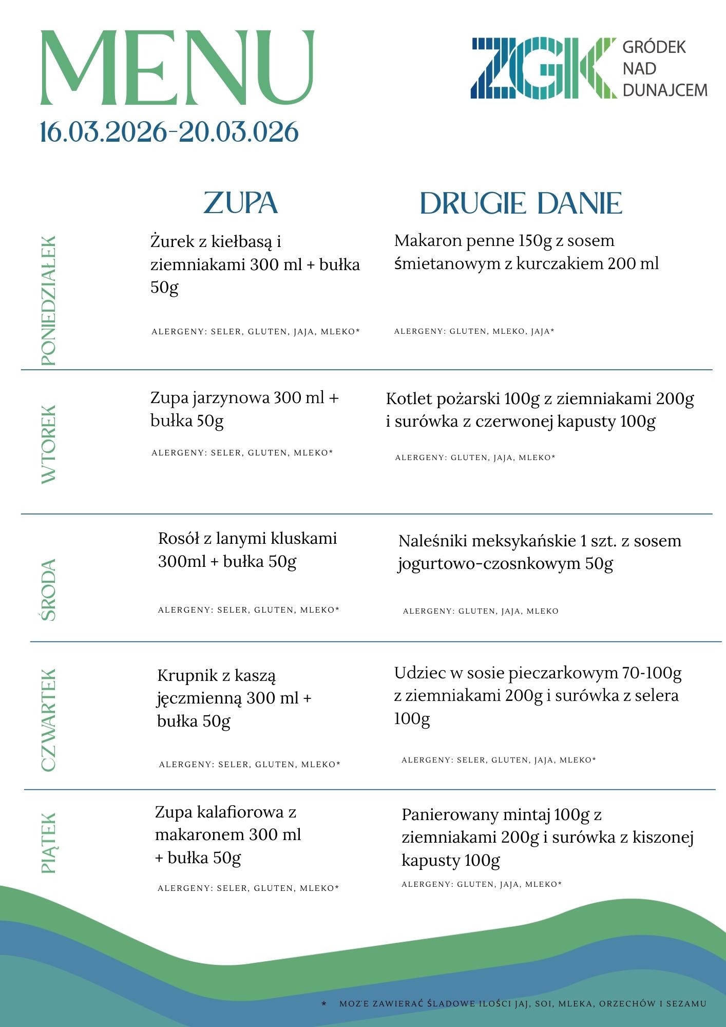 STOŁÓWKA GMINNA - Jadłospis 16.03.2026 - 20.03.2026